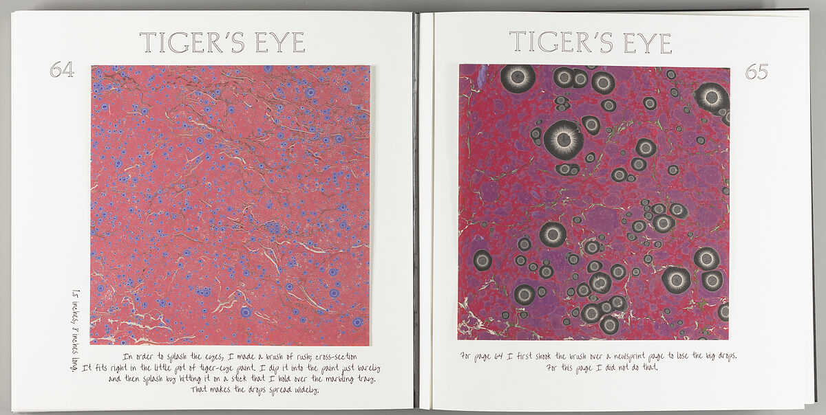 The samples are divided into six chapters: classical marbling, granulating paint marbling, 'double print' marbling, a chapter titled 'dear mistakes' which focuses on common mistakes that are made during the hand-marbling process, Dutch suminagashi marbling, and finally Frigge's take on Turkish Ebru 'Tiger-Eye' marbling. The book has twelve pages of text, with captions, and three explanatory drawings. The text explains the method and many tips for the marble, such as the recipe for Potah Paste. -- Publisher