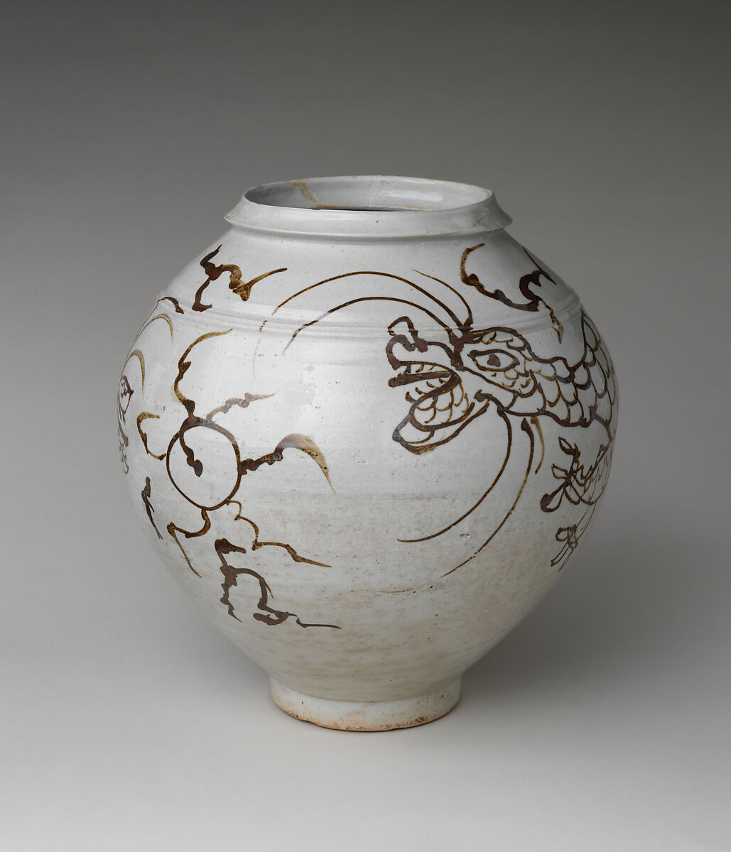 This jar is decorated with two dragons pursuing a flaming jewel. The dragons are whimsically and dynamically rendered through energetic brushwork using iron-brown pigments rather than cobalt blue or copper red—colorants that were less readily available during the Joseon’s recovery after repelling invasions in the late 16th and early 17th centuries. The jar’s buoyant, slightly asymmetrical silhouette is similar to that of so-called moon jars, undecorated white porcelain jars popular in the17th and 18th centuries.