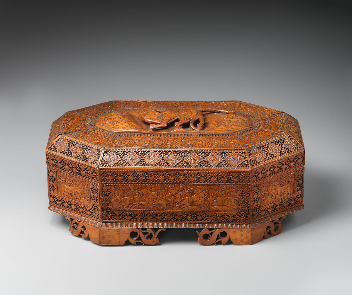 This elaborately carved box is the only example of its kind to be inscribed and dated. The charming hunting vignettes and animal combat scenes suggest that it was intended for a prince or a nobleman. Carved of pearwood, it was likely made in Abadeh, known for centuries as a center for the production of finely carved wooden boxes and implements such as spoons. The date places it before the sack of Isfahan in 1722 which suggests that Abadeh was a center for wood carving much earlier than previously believed.