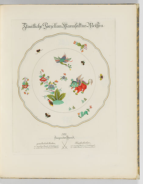 This album is an extremely rare example of the demonstration catalogues produced by the Meissen manufactory for their most exclusive customers. According to the Meissen archive, three distinct books were produced around 1920: one containing underglaze patterns; one containing floral patterns; and the present "Indische Muster", which contains an array of designs inspired by historic decorations from different countries in Asia including Japan, China, and India. Each design is executed in line etching only, and then finished by hand with watercolor and gilding by the porcelain painters employed by the Meissen manufactory. The colors vary from monochrome schemes to bright multicolored palettes. The name "Staatliche Porzellan Manufaktur Meissen" is etched in calligraphic script above each pattern, and below the design, the name of the pattern is identified together with a numbered list of the color schemes in which the pattern was available with further details about the colors used within each scheme. Many of the patterns date back to the founding of the Meissen firm in the early 18th century. For example, one of the most expressive patterns in the album, the so-called "Ming Dragon motif" (pattern numbers 78 and 80), was developed as early as 1740. Another pattern, inspired by Japanese Kakiemon porcelain, is found on a plate in the Museum's collection from about 1730 that originally belonged to Augustus II (1670–1733), elector of Saxony and king of Poland, who was an avid collector of East Asian porcelain. The production of the album in the 1920s demonstrates the popularity and longevity of many of these patterns. Its careful production in hand-colored etchings printed on folio-sized high-quality paper further speaks to a tradition of creating bespoke print series and catalogues that similarly finds its roots in eighteenth century. More specifically, the 1919 annual report of the Meissen firm indicates that the idea to produce these catalogues was directly inspired by the devastations of World War I. In an effort of restoration, the firm advocated for a return to the cultural values and high-quality handwork of the past.