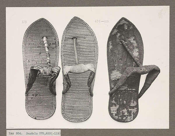 Tutankhamun's famous sandals of gold sheet (see TAA 599) were created specifically for the burial; it would have been impossible to walk in them. The metal shoes had been put on his feet before his body was wrapped. They were removed together with the gold finger and toe stalls when Tutankhamun's mummy was unwrapped in 1925. Such procedures were common at the time but are no longer practiced.