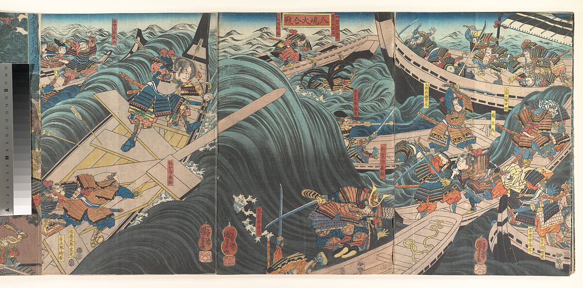 This triptych depicts a confrontation at sea between forces aligned with the rival Taira and Minamoto clans during the Battle of Yashima, which took place in the spring of 1185 during the Genpei civil war.