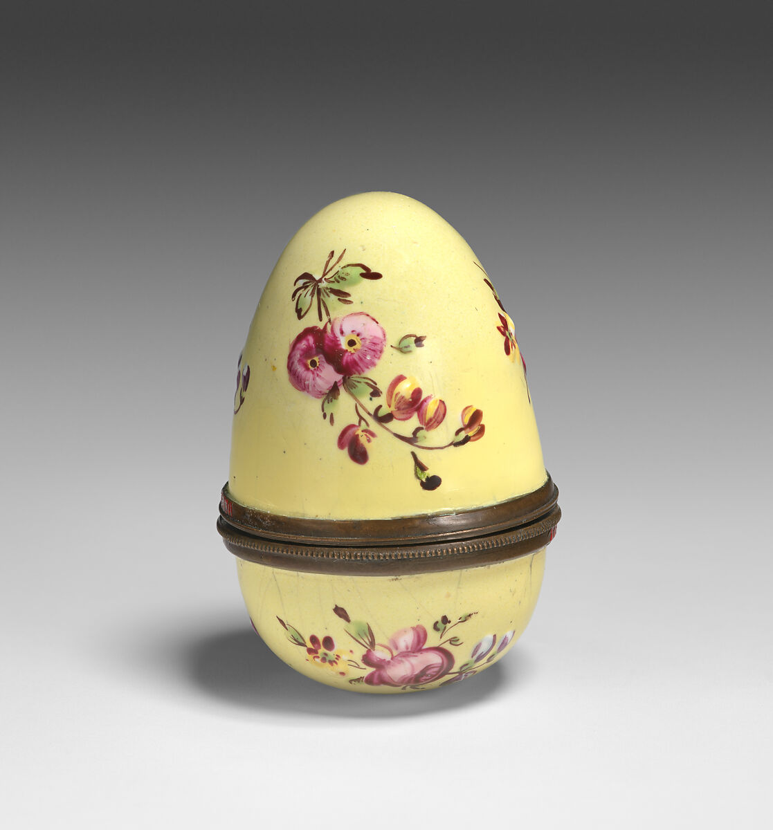 Enameled objects like this one, intended to imitate the lustrous quality of porcelain, were among the more affordable goods sold at toyshops across London and in fashionable English resort towns. Though often called "Battersea enamels" in common parlance (referring to the manufactory at York House, Battersea, operating only between 1753 and 1756), we rarely know exactly where individual pieces were made. The main centers of enamel production were in London, South Staffordshire (particularly in Bilston and Wednesbury), and Birmingham.