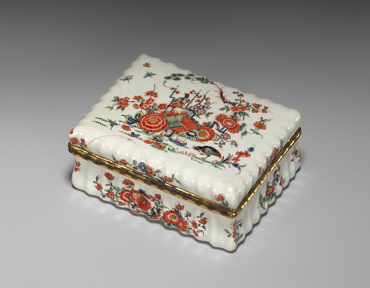 The vivid floral designs that decorate this box are inspired by mid-seventeenth and eighteenth-century Kakiemon ware, a style of Japanese porcelain that was created largely for European export and subsequently replicated by many European porcelain manufactories.
