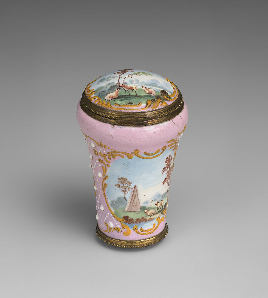 Enameled objects like this one, intended to imitate the lustrous quality of porcelain, were among the more affordable goods sold at toyshops across London and in fashionable English resort towns. Though often called "Battersea enamels" in common parlance (referring to the manufactory at York House, Battersea, operating only between 1753 and 1756), we rarely know exactly where individual pieces were made. The main centers of enamel production were in London, South Staffordshire (particularly in Bilston and Wednesbury), and Birmingham.