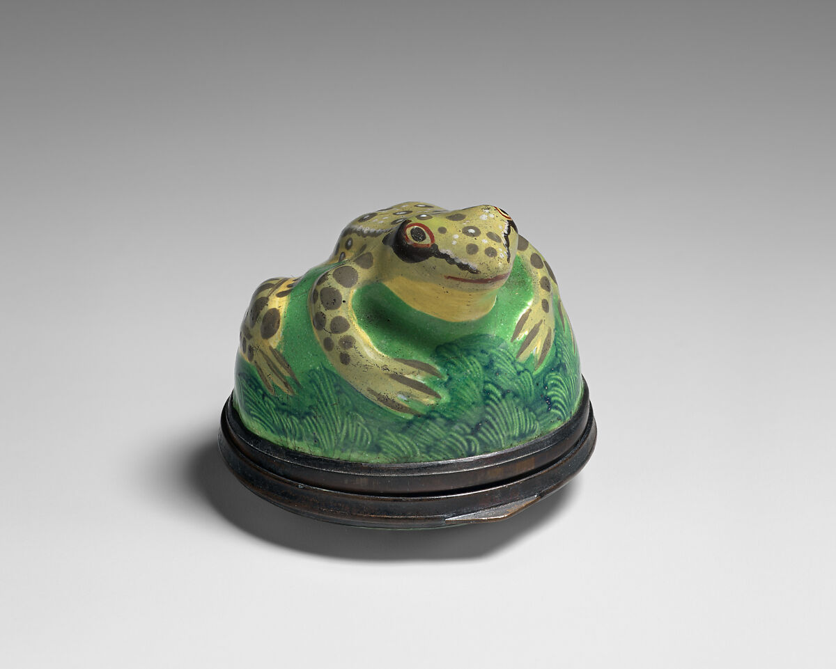 Enameled objects like this one, intended to imitate the lustrous quality of porcelain, were among the more affordable goods sold at toyshops across London and in fashionable English resort towns. Though often called "Battersea enamels" in common parlance (referring to the manufactory at York House, Battersea, operating only between 1753 and 1756), we rarely know exactly where individual pieces were made. The main centers of enamel production were in London, South Staffordshire (particularly in Bilston and Wednesbury), and Birmingham.