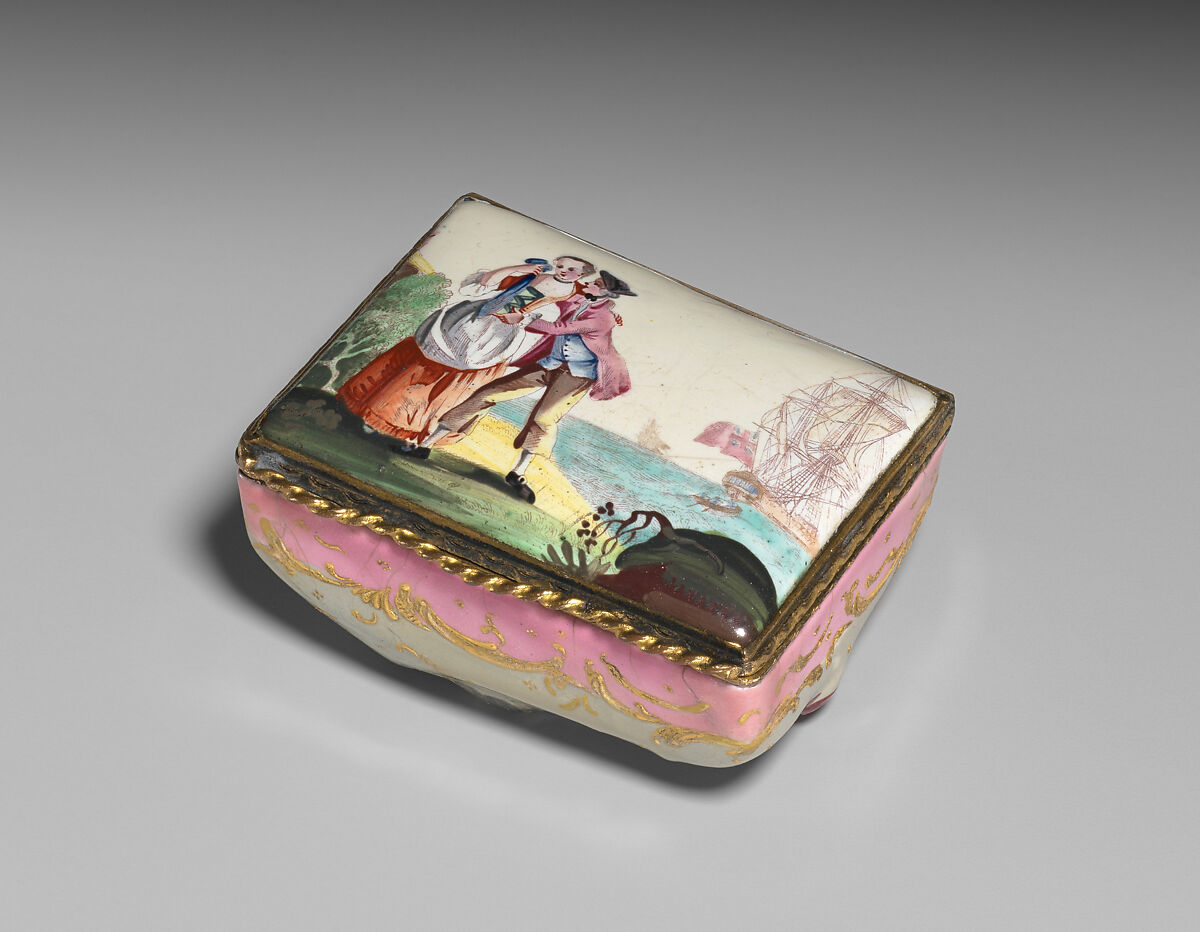 Enameled objects like this one, intended to imitate the lustrous quality of porcelain, were among the more affordable goods sold at toyshops across London and in fashionable English resort towns. Though often called "Battersea enamels" in common parlance (referring to the manufactory at York House, Battersea, operating only between 1753 and 1756), we rarely know exactly where individual pieces were made. The main centers of enamel production were in London, South Staffordshire (particularly in Bilston and Wednesbury), and Birmingham.