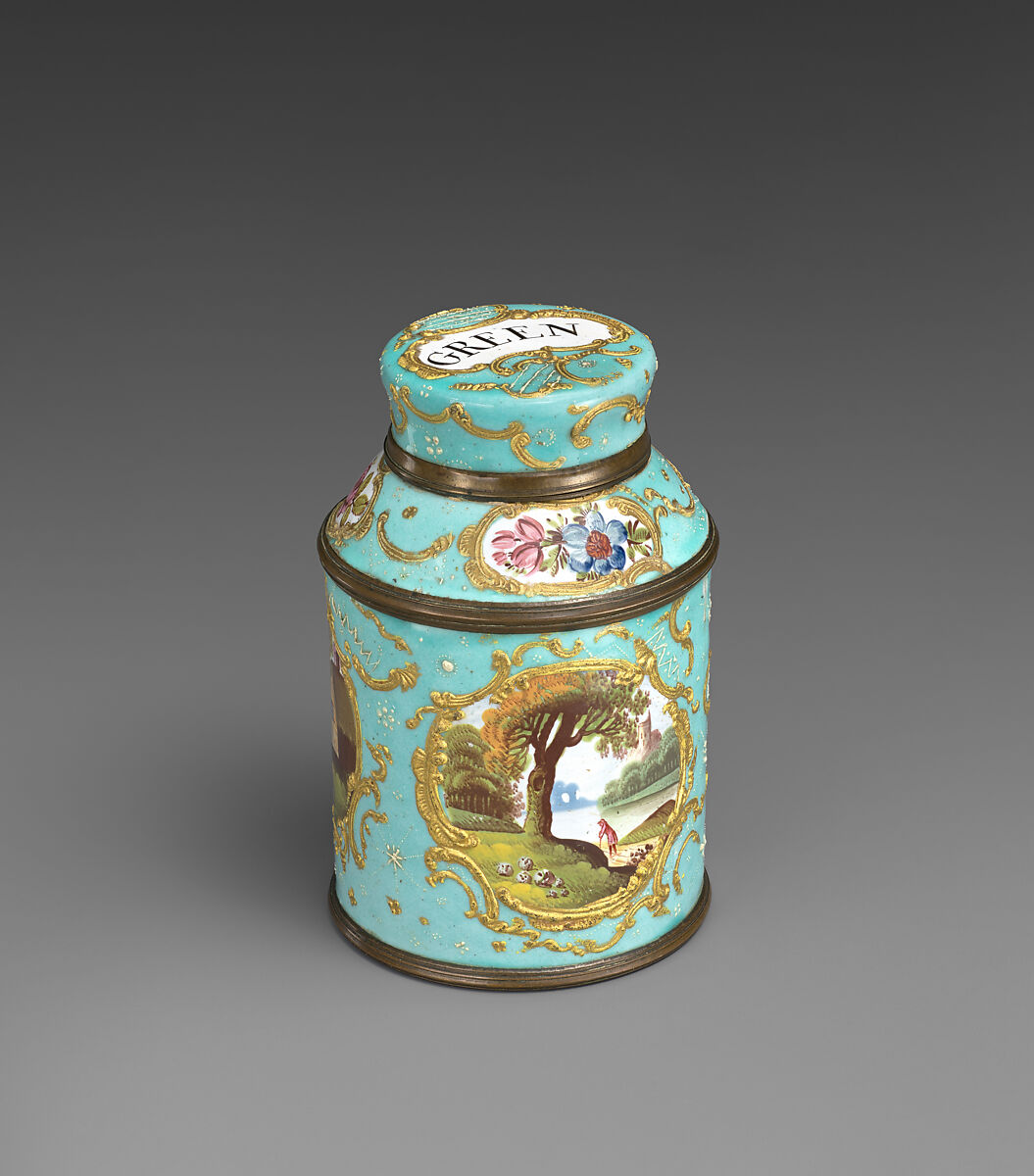Over the course of the eighteenth century, tea (imported from China in increasingly high volumes) and sugar (widely available because of the enslaved labor on plantations in the British West Indies) became relatively accessible luxuries for many British households. Tea and sugar were still expensive enough to warrant storage under lock and key, however. This tea caddy, labeled "green," would likely have been stored within a lockable chest alongside a matching caddy for black tea and a sugar box.