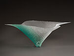 In recent decades, several Japanese glass artists have attracted international attention. Sato Shizue (b. 1983) is an up-and-coming young artist who creates unique glass sculptures using a technique she developed and perfected. The artist first puts glass paste (glass powder mixed with glue and water) into a pastry bag and by squeezing it draws lines in a mesh pattern. The mesh pattern is then fired to make it solid. In a second firing, she puts the glass mesh sheet into a mold made of fire-proof material and makes it sag using heat and gravity. During this process, she opens the kiln and puts a lump of glass onto the center of the glass mesh sheet to make it sink to the bottom of the mold. Finally, the glass sculpture is removed from the mold and finished by removing the fringes. Sato used green pigment to create an even more powerful visual effect. The result looks like a fishing net sinking in water, pulled down by a stone. The net structure has holes and tears intended to suggest extensive use. This torn net pattern sometimes appears as a decorative motif on Edo-period ceramics. Its three-dimensional realization in glass is a new expression. The artistic practices of blowing, polishing, casting, and cutting glass are all standard techniques. Sato wanted to devise a new method to achieve her sculptural forms. As with an actual net, the glass mesh represents a transparent, permeable medium while its sagging form imparts a vivid sense of motion.