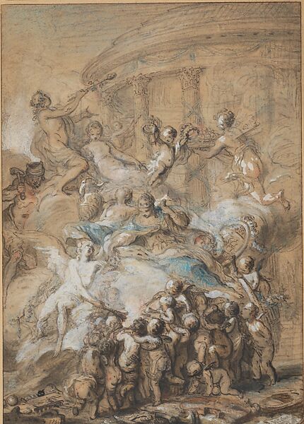 After producing several allegories celebrating the royal birth, Saint-Aubin changed tack and devised a more complex composition commemorating the dowries that were distributed to six hundred less privileged young women. The marriages took place on a single day, November 9, 1751, in churches throughout the city. This large ebullient drawing in ink, wash, and colored chalks was etched by the artist on a smaller scale (1977.530.1).