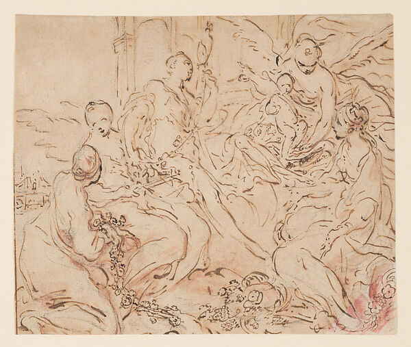 - Medium:Pen and brown ink over black chalk with brush and pink wash