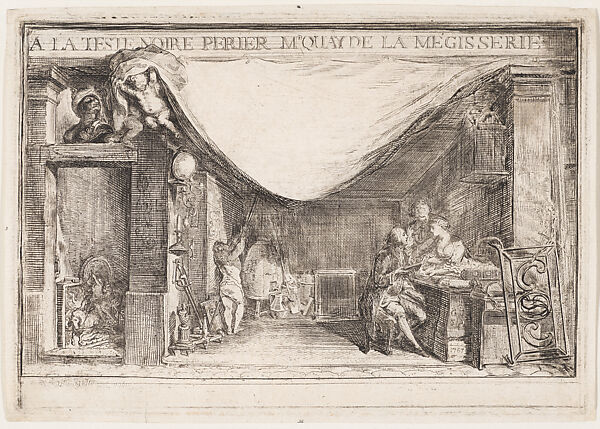 Eighteenth-century trade cards were the precursors of modern business cards and could also function as advertisements. Saint-Aubin made this design for an ironmonger in his neighborhood, employing the conceit of showing the shop as if its facade had been removed. A flirtatious encounter between a saleswoman and a male customer takes place amid a jumble of metal grates, light fixtures, and fireplace tools.