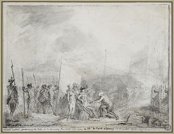 In the last months of his life, Saint-Aubin made two drawings glorifying the French capture of Grenada in 1779. Here, we see the surrender of the British governor George Macartney, first earl Macartney (1737–1806).