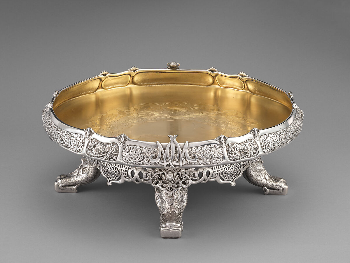 This silver ice cream dish and accompanying plates are part of one of the most renowned and lavish dinner services ever created in America. Commissioned in 1877 by John W. (1831-1902) and Marie Louise Hungerford (1843-1928) Mackay, the dinner service for twenty-four consisted of over 1,250 pieces. A poor Irish immigrant with little education, John W. Mackay became one of the wealthiest men in America when he and three partners, James Fair, James Flood, and William O’Brien, struck a silver deposit known as "The Big Bonanza" at Nevada’s Comstock Lode in 1873. During a visit to the mine, Marie Louise asked her husband for a silver dinner service "made by the finest silversmith in the country." Her husband responded, "You shall have it. I like the notion of eating off silver brought straight from the Comstock." He proceeded to have a half ton of silver delivered from the mine to Tiffany & Co., where two hundred men worked for almost two years to complete the commission. In 1878 the service was sent to be featured in Tiffany’s award-winning display at the Paris Exposition Universelle before being delivered to the Mackay’s home at 9 Rue de Tilsitt near the Arc de Triomphe. In an era of extravagant social affairs, Mrs. Mackay’s dinners and balls were legendary. Identified in firm records as "Indian," "Persian," and "Sou Chow" in style, the Mackay service reflects the sophisticated and innovative design sensibilities of Edward C. Moore, the head of Tiffany’s silver division, and the team of designers, chasers, and craftsmen who conceived and realized this commission. The descriptor "Sou chow" was used at Tiffany for designs featuring elaborately chased decoration inspired by Chinese, Japanese and Indian sources, all of which were extensively represented in the vast collection of works of art Moore assembled to inspire and educate himself and his staff. The masterfully chased ornament featuring a dense composition of flowers flowing into sinuous elephant trunk feet embodies Gilded Age extravagance and would have offered a dazzling finale to a meal served on a sea of silver featuring an inventive combination of Asian, Near Eastern, and Indian artistic vocabularies and aesthetic sensibilities.