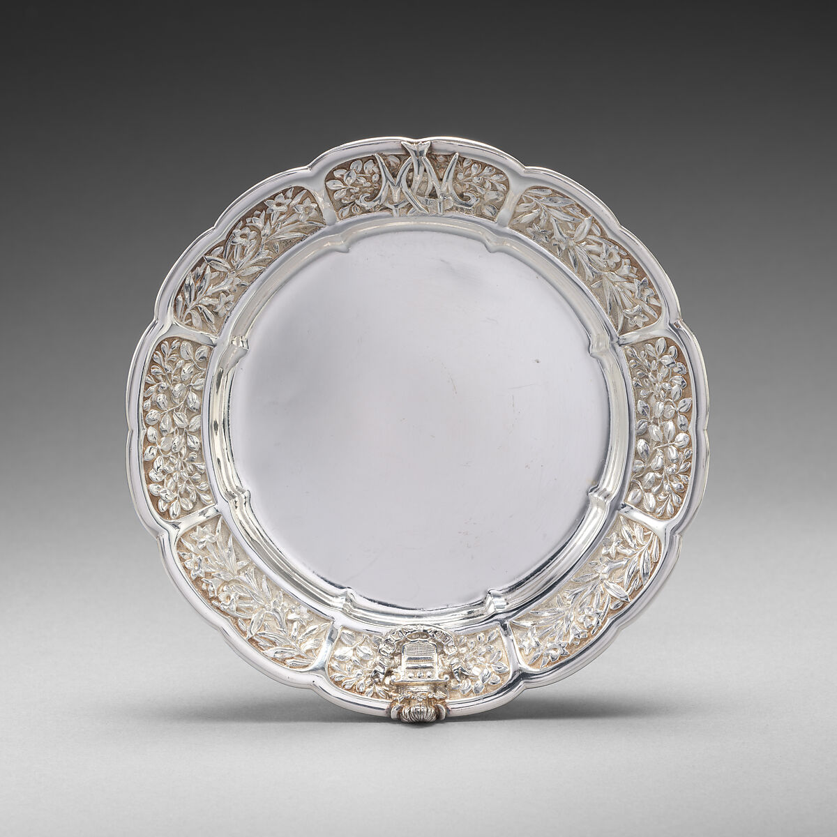This silver ice cream dish and accompanying plates are part of one of the most renowned and lavish dinner services ever created in America. Commissioned in 1877 by John W. (1831-1902) and Marie Louise Hungerford (1843-1928) Mackay, the dinner service for twenty-four consisted of over 1,250 pieces. A poor Irish immigrant with little education, John W. Mackay became one of the wealthiest men in America when he and three partners, James Fair, James Flood, and William O’Brien, struck a silver deposit known as "The Big Bonanza" at Nevada’s Comstock Lode in 1873. During a visit to the mine, Marie Louise asked her husband for a silver dinner service "made by the finest silversmith in the country." Her husband responded, "You shall have it. I like the notion of eating off silver brought straight from the Comstock." He proceeded to have a half ton of silver delivered from the mine to Tiffany & Co., where two hundred men worked for almost two years to complete the commission. In 1878 the service was sent to be featured in Tiffany’s award-winning display at the Paris Exposition Universelle before being delivered to the Mackay’s home at 9 Rue de Tilsitt near the Arc de Triomphe. In an era of extravagant social affairs, Mrs. Mackay’s dinners and balls were legendary. Identified in firm records as "Indian," "Persian," and "Sou Chow" in style, the Mackay service reflects the sophisticated and innovative design sensibilities of Edward C. Moore, the head of Tiffany’s silver division, and the team of designers, chasers, and craftsmen who conceived and realized this commission. The descriptor "Sou chow" was used at Tiffany for designs featuring elaborately chased decoration inspired by Chinese, Japanese and Indian sources, all of which were extensively represented in the vast collection of works of art Moore assembled to inspire and educate himself and his staff. The masterfully chased ornament featuring a dense composition of flowers flowing into sinuous elephant trunk feet embodies Gilded Age extravagance and would have offered a dazzling finale to a meal served on a sea of silver featuring an inventive combination of Asian, Near Eastern, and Indian artistic vocabularies and aesthetic sensibilities.