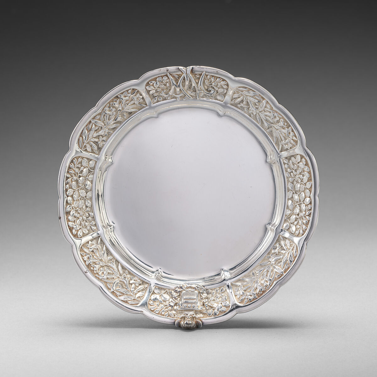 This silver ice cream dish and accompanying plates are part of one of the most renowned and lavish dinner services ever created in America. Commissioned in 1877 by John W. (1831-1902) and Marie Louise Hungerford (1843-1928) Mackay, the dinner service for twenty-four consisted of over 1,250 pieces. A poor Irish immigrant with little education, John W. Mackay became one of the wealthiest men in America when he and three partners, James Fair, James Flood, and William O’Brien, struck a silver deposit known as "The Big Bonanza" at Nevada’s Comstock Lode in 1873. During a visit to the mine, Marie Louise asked her husband for a silver dinner service "made by the finest silversmith in the country." Her husband responded, "You shall have it. I like the notion of eating off silver brought straight from the Comstock." He proceeded to have a half ton of silver delivered from the mine to Tiffany & Co., where two hundred men worked for almost two years to complete the commission. In 1878 the service was sent to be featured in Tiffany’s award-winning display at the Paris Exposition Universelle before being delivered to the Mackay’s home at 9 Rue de Tilsitt near the Arc de Triomphe. In an era of extravagant social affairs, Mrs. Mackay’s dinners and balls were legendary. Identified in firm records as "Indian," "Persian," and "Sou Chow" in style, the Mackay service reflects the sophisticated and innovative design sensibilities of Edward C. Moore, the head of Tiffany’s silver division, and the team of designers, chasers, and craftsmen who conceived and realized this commission. The descriptor "Sou chow" was used at Tiffany for designs featuring elaborately chased decoration inspired by Chinese, Japanese and Indian sources, all of which were extensively represented in the vast collection of works of art Moore assembled to inspire and educate himself and his staff. The masterfully chased ornament featuring a dense composition of flowers flowing into sinuous elephant trunk feet embodies Gilded Age extravagance and would have offered a dazzling finale to a meal served on a sea of silver featuring an inventive combination of Asian, Near Eastern, and Indian artistic vocabularies and aesthetic sensibilities.
