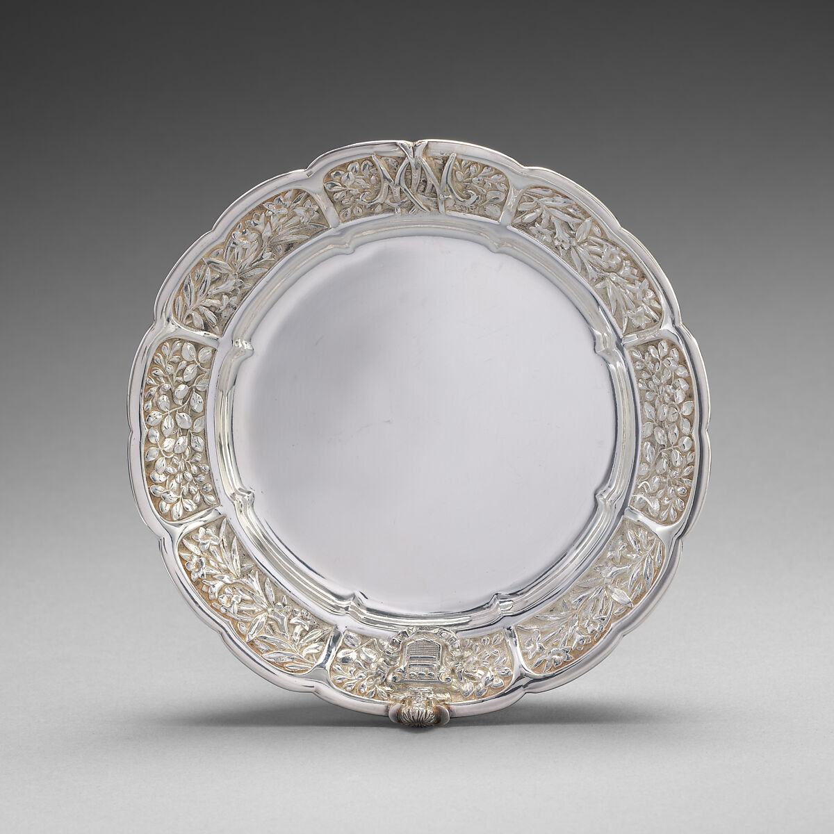 This silver ice cream dish and accompanying plates are part of one of the most renowned and lavish dinner services ever created in America. Commissioned in 1877 by John W. (1831-1902) and Marie Louise Hungerford (1843-1928) Mackay, the dinner service for twenty-four consisted of over 1,250 pieces. A poor Irish immigrant with little education, John W. Mackay became one of the wealthiest men in America when he and three partners, James Fair, James Flood, and William O’Brien, struck a silver deposit known as "The Big Bonanza" at Nevada’s Comstock Lode in 1873. During a visit to the mine, Marie Louise asked her husband for a silver dinner service "made by the finest silversmith in the country." Her husband responded, "You shall have it. I like the notion of eating off silver brought straight from the Comstock." He proceeded to have a half ton of silver delivered from the mine to Tiffany & Co., where two hundred men worked for almost two years to complete the commission. In 1878 the service was sent to be featured in Tiffany’s award-winning display at the Paris Exposition Universelle before being delivered to the Mackay’s home at 9 Rue de Tilsitt near the Arc de Triomphe. In an era of extravagant social affairs, Mrs. Mackay’s dinners and balls were legendary. Identified in firm records as "Indian," "Persian," and "Sou Chow" in style, the Mackay service reflects the sophisticated and innovative design sensibilities of Edward C. Moore, the head of Tiffany’s silver division, and the team of designers, chasers, and craftsmen who conceived and realized this commission. The descriptor "Sou chow" was used at Tiffany for designs featuring elaborately chased decoration inspired by Chinese, Japanese and Indian sources, all of which were extensively represented in the vast collection of works of art Moore assembled to inspire and educate himself and his staff. The masterfully chased ornament featuring a dense composition of flowers flowing into sinuous elephant trunk feet embodies Gilded Age extravagance and would have offered a dazzling finale to a meal served on a sea of silver featuring an inventive combination of Asian, Near Eastern, and Indian artistic vocabularies and aesthetic sensibilities.
