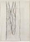 This sheet, along with two related works, is an early example from Kelly’s body of drawings representing the contours of leaves, plants, trees, fruits, and flowers, a practice begun around 1948 at his summertime retreat along the Atlantic coast of France. As Katherine Sachs writes in the catalogue for the Philadelphia Museum of Art’s 2009 exhibition Cézanne and Beyond, which included this trio, Kelly had long admired Cézanne’s painting Chestnut Trees at the Jas de Bouffan (ca. 1885–86, Minneapolis Institute of Art), which he first encountered in Rockwell Kent’s book World-Famous Paintings. The canvas shows a line of dark tree trunks silhouetted against a scenic backdrop with a country wall, green hill, and Mont Saint Victoire in the distance. Kelly was particularly attracted to the way the trees form a screen that fractures the view and creates fascinating, geometric forms in between their trunks and branches. For Kelly, the negative space between shapes is often just as important, if not more so, than the shapes themselves. Here, the same trunk(s) of trees create delicately shifting, serpentine forms between and around them, producing readymade geometries of natural design, closely observed.