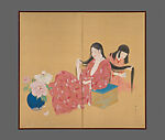 A young woman in pale red under kimono (nagajuban) with dandelion motifs sits languorously on the floor leaning on a padded lacquer armrest as she twirls long strands of her hair. Her pale complexion is flawless, her cheeks are slightly flushed, and her lipstick brilliant red. She gazes sulkily at a cluster of peonies that have passed their peak of bloom—petals are already falling—in a globular jardiniere with a deep blue drip glaze. Behind her a young girl attendant in a simple red and white tie-dyed (shibori) kimono gently clasps another long lock of the woman’s hair while attempting to scent it with a handheld incense burner. Gold leaf was applied on the reverse side of the silk substrate (urahaku), imparting a soft glow to the painting. The entire ambience of the scene, while gorgeous, projects an air of glorious decadence and anachronism—an impression compounded by this method of scenting hair, which fell out of use in Japan by the eighteenth century. It was most common for a woman to scent hair in early modern Japan using an “incense pillow” (kōmakura).