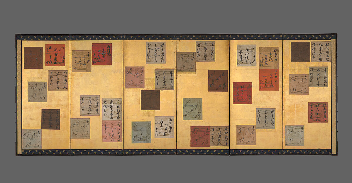 - Medium:Pair of six-panel folding screens; ink, color, and metallic pigments on decorated-paper shikishi (poetry cards) on gold leaf