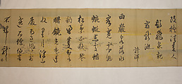 A revival of ancient brush-writing techniques flourished beginning in the seventeenth century and was known as the Daishi lineage. This handscroll, rendered by the samurai and master calligrapher Okamoto Hansuke, evokes the style of Monk Kūkai (774–835), who founded the Shingon sect of Esoteric Buddhism. Hansuke selected poems about Buddhist and Daoist sanctuaries from Poetry in Three Styles, an anthology of poetry of the Tang dynasty (618–907) compiled in 1250.
