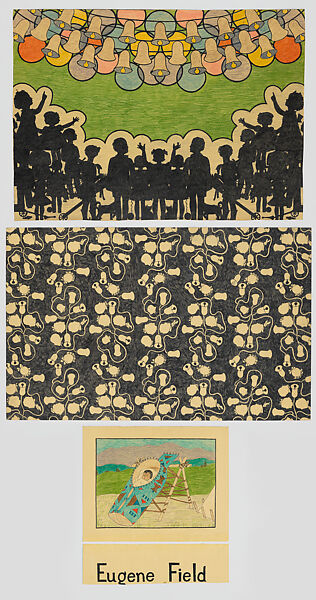 This is among Sully’s most distinctive “personality prints,” as it features two figural panels. The top pictures a group of children, in black silhouette, responding to an aural and visual sounding of colorful bells; in the middle, the motif of bells and profiles is abstracted in a dialogue between positive and negative space. The bottom panel, likely a drawing Sully produced to accompany her sister Ella Deloria’s ethnographic writing (possibly a book for children), shows a baby in a cradleboard near a Plains tipi. The writer Eugene Field is best remembered for his children’s poetry, such as “Wynken, Blynken, and Nod” and “Little Boy Blue.” Here, Sully appears to be referencing his “Why Do the Bells of Christmas Ring?,” which was widely read in the 1920s and 1930s. Field was profiled in a 1939 issue of Time magazine that Sully may have encountered.