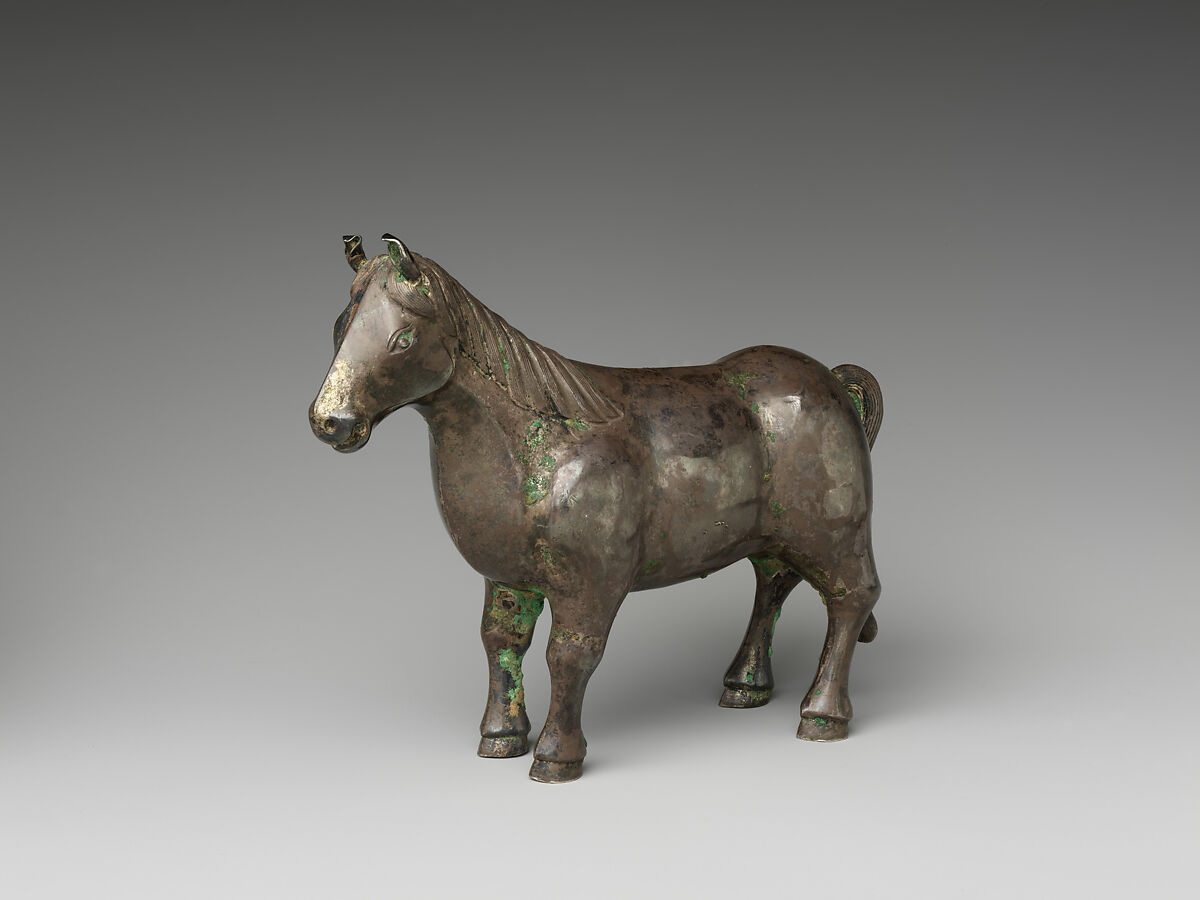 Cast in silver, this elegant standing horse may have served as a paperweight on a scholar’s desk. The figure reflects both the refined metalwork and cultivated aesthetics valued by intellectuals of the period.