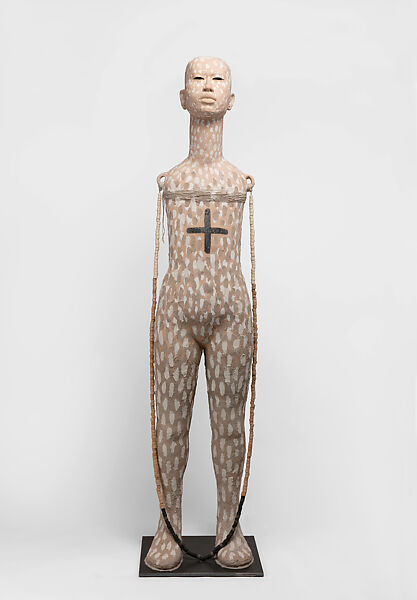 This sculpture evokes a state of being rather than of doing. "If I stay in a state of faith," the artist has said of this piece, "I can let go of a lot of fear." Indeed, the figure’s hollow core creates an internal space largely cut off from the outside world. Only its eyes provide a portal between the two; instead of arms, two handles appear at the shoulders evoking a water vessel. The figure’s affectless expression similarly offers little by way of interpretation. At the same time, two black lines create a cross on the figure’s midsection that the artist defines as a star indicating the cardinal directions. The mark represents a source of orientation and guidance.