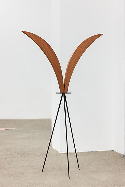 Heritage Studies #7 is part of an ongoing series by the Egyptian American artist Iman Issa that imaginatively recasts ancient Egyptian and Islamic artifacts and architectural remnants as geometrically abstract, minimal sculptures. This elegant wooden form and its slender metal tripod are accompanied by a vinyl wall text that describes a quartzite "Statue of King Ahmose; Unifier of the land who established the country’s national borders, which it retains to this day." The discrepancy between that text’s apocryphal historical reference and the sculpture’s emphatically modern minimalist form—what we might call its speculative temporality—provokes productive questions about the manipulability, stakes, and stewardship of ancient history.
