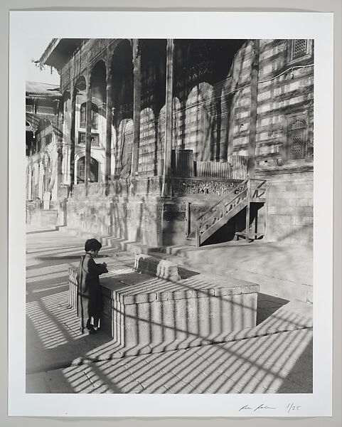 This image depicts the shrine of Shah Hamadan (Mir Sayyid Ali Hamdani)—an important saintly figure from Hamadan, Iran—in Srinagar, Kashmir. Built by Sultan Sikandar in the late 14th century, the shrine subsequently suffered several fires and the current structure dates to the eighteenth century.The photograph captures the woodwork panels and tall arches that surround the central structure in a striking interplay of banded shadows and stripes. A small boy stands by an outdoor grave.
