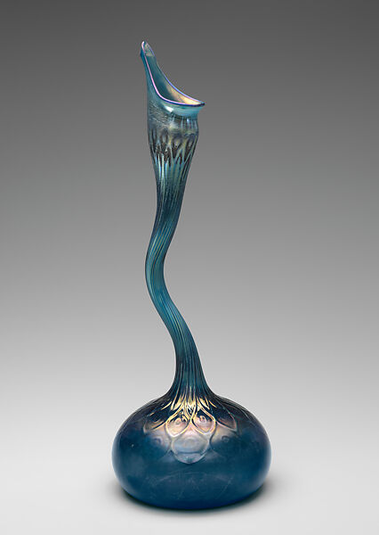 The elegant form and sinuous contours of this favrile glass swan-neck bottle by Louis Comfort Tiffany resemble that of nineteenth-century Persian glass vessels commonly referred to as “ashkdans” (tear-catchers) distinguished by their sculpted eyecups. Likely produced in Shiraz or Isfahan and used locally as containers for wine, perfume, or rosewater, these glass bottles were also popular among European and American collectors. Tiffany likely owned at least one. He may have also been familiar with the collections of Edward C. Moore, the chief designer at his father’s firm, Tiffany & Co., who had such examples of Persian glass in his personal collection, which he bequeathed to the Museum in 1891 (91.1.1559), shortly before Tiffany began his experiments with blown glass.