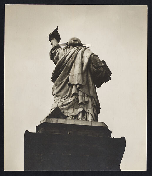 The photograph was also published in 1933 under the title “Liberty, Backward and Fore-Shortened,” in the short-lived satirical tabloid, Americana, edited by Alexander King, Gilbert Seldes, and George Grosz. This context suggestts a more politicized reading of the photograph as a critique of the America’s inflated self-regard, and the divergence between the statue’s symbolism and the political reality of the United States’ restrictive immigration policies in the early 1930s.