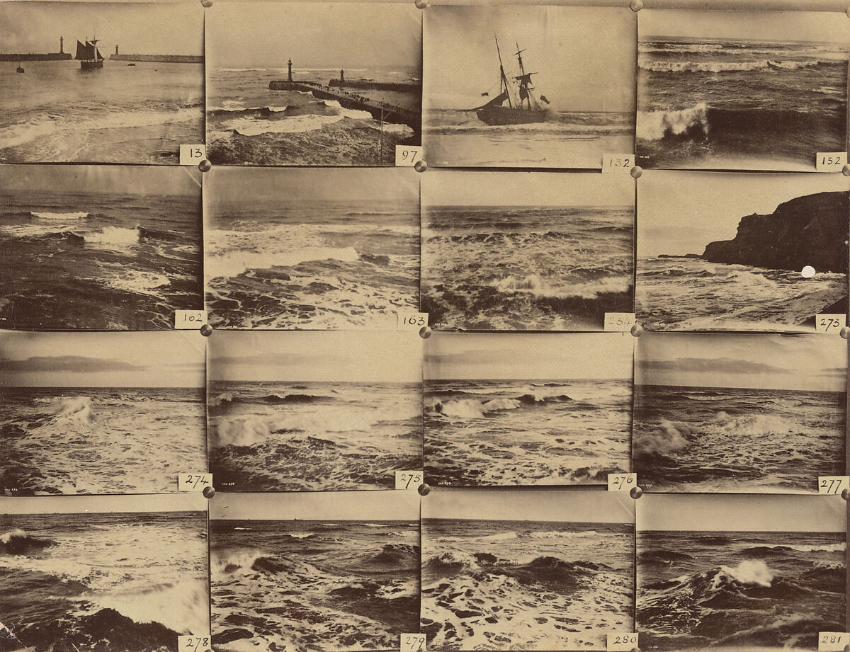 "Choose one subject, anything will do," Frank Sutcliffe advised aspiring photographers. If his career-spanning preoccupation with the British seaside town of Whitby seemed myopic to some peers, it allowed him to cultivate a distinctive brand. This typology of seascapes testifies to his years of work along the town harbor, where he weathered storms and punishing wind in pursuit of the perfect view. Pinned up for purchase at an exhibition, his photographs here become products. This rudimentary style of display seems to have served him well; at one such showcase, he counted the Prince of Wales among his customers.