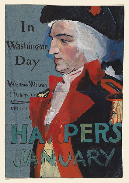 Penfield’s study for the poster advertising the January 1896 issue of Harper’s contains the hallmarks of his influential style. In the sparse composition, George Washington is set against a plain blue background, and the lettering is done by hand rather than letterpress—a technique commonly used for printing type. Penfield altered the composition for the final version, rendering Washington frontally rather than in profile. The study provides a glimpse into poster production in the 1890s, when publishing firms such as Harper’s spearheaded technical and stylistic innovations in the field of graphic design.