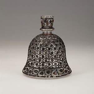 Waterpipes (huqqas) formed part of the elegant trappings of the opulent courts of south Asia. Beautifully fashioned examples such as this item were used by the rulers themselves, and sometimes their wives. This huqqa base is made of transparent glass, with a bell-shaped body, a slim neck, a drip-guard, and a slightly flaring rim. Apart from the lower neck, which is free of decoration, the entire surface has a textile-like decorative scheme containing silver appliqué that shimmers around surviving fragments of colored glass inlays in red and green.