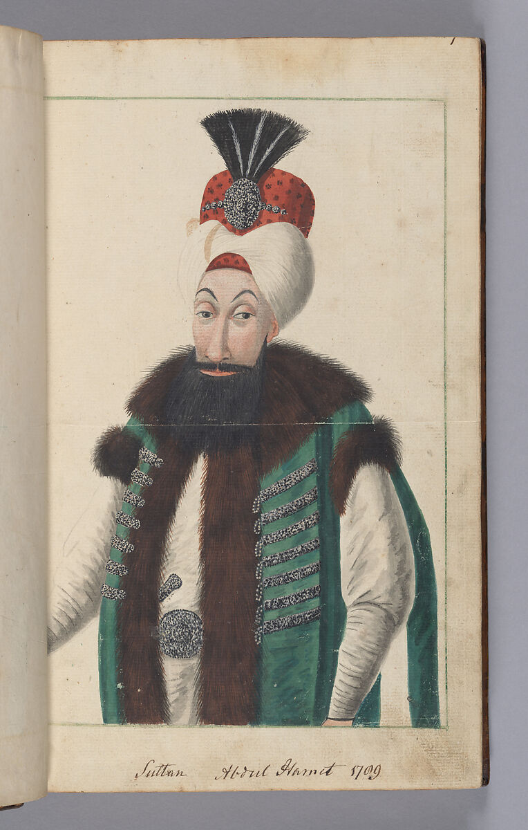 This album of costumes from Constantinople captures the diversity of people and costumes in this cosmopolitan city at the end of the 18th century. The painter, identified as Greek, both from the inscription and from the style, may have also been painting icons, as some of the modelling shows a green undertone. The album opens with a half-length portrait of Sultan Abdul Hamid I and is followed by 66 full length portraits of officials, soldiers, sailors, traders and ladies. They are identified by Italian inscriptions below each figure.