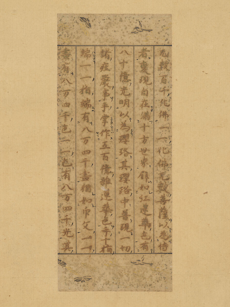 Over the centuries, sutra handscrolls were often cut up into sections and remounted as hanging scrolls to make them more suitable for display. This section is from a manuscript of the Sutra on the Contemplation of Immeasurable Life (Amitayurdhyana), in which the Buddha describes thirteen subjects of reflection to guide adherents to the Pure Land paradise. The text in this fragment describes the attributes of Kannon.