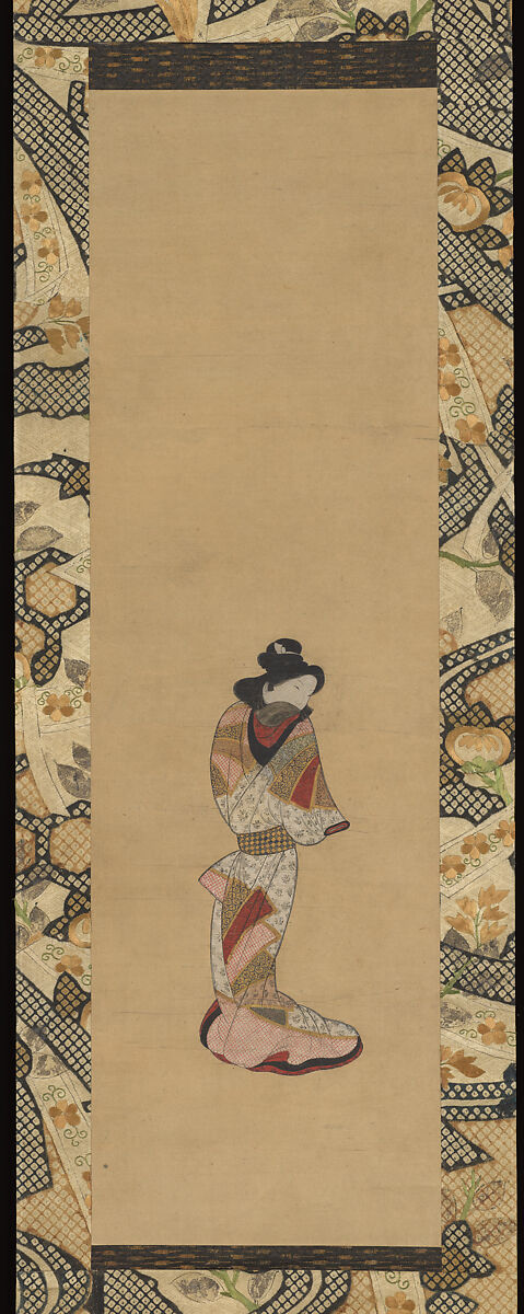 Kanbun bijin (Beauties of the Kanbun Era) is a genre of painting of the late seventeenth century in which a gorgeously garbed figure is elegantly posed against a blank background. The Kanbun era officially lasted about a decade, from 1661 to 1672, but the historical designation is used more expansively to refer to the 1660s through 1680s. The origins of Kanbun bijin can be traced to early seventeenth-century paintings of everyday life, often populated by large numbers of people enjoying leisurely outdoor pursuits, such as picnicking, or indulging in indoor amusements like playing games, dancing, or attending plays. Kanbun bijin paintings, like their precedents, were generally created by little-known artists, no doubt in a studio environment.