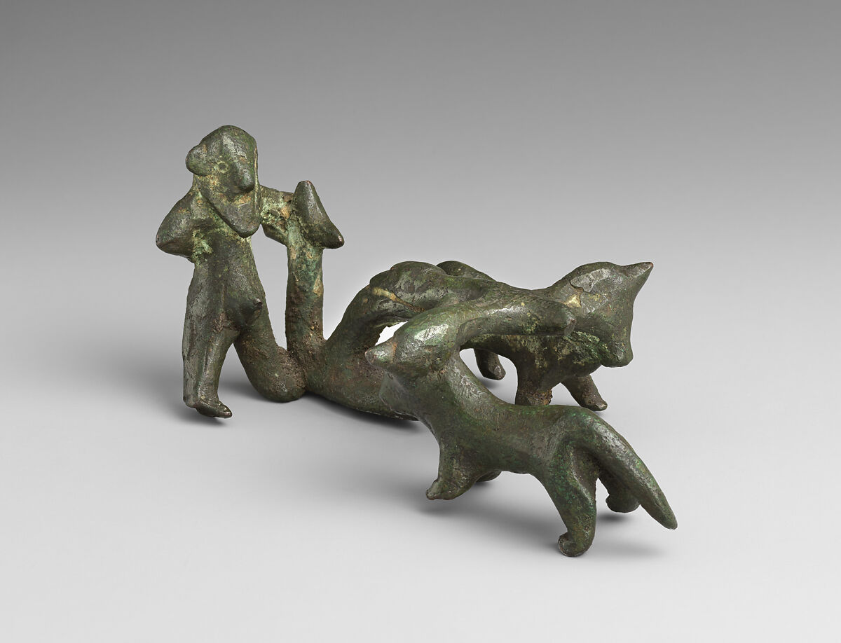 This unusual scene depicts a naked man plowing. Two oxen yoked together by the horns walk in opposite directions, possibly representing the turn at the end of the furrow. The statuette likely comes from the area around Smyrna in present-day Turkey, where more than seventy small bronzes of similar workmanship—including eight nearly identical to this one—were discovered before 1850. They were probably votive offerings dedicated to a deity associated with agriculture and fertility, such as the Anatolian goddess Kybele.
