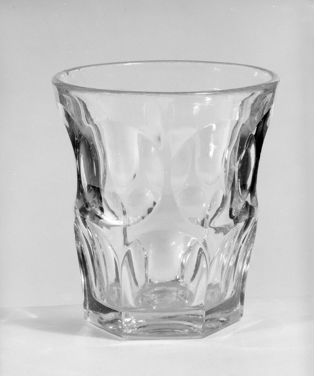 With the development of new formulas and techniques, glass-pressing technology had improved markedly by the late 1840s. By this time, pressed tablewares were being produced in large matching sets and innumerable forms. During the mid-1850s, colorless glass and simple geometric patterns dominated. Catering to the demand for moderately-priced dining wares, the glass industry in the United States expanded widely, and numerous factories supplied less expensive pressed glassware to the growing market. At the Exhibition of the Industry of All Nations at New York’s Crystal Palace in 1853, for example, the New England Glass Company exhibited 130 pieces of one design, "consisting of bowls, tumblers, champagnes, wines, and jelly glasses." This object belongs to one such service. Although the glass manufactory is not known, the glassware is very typical of the large services that were very popular with America’s middle class in the nineteenth century.
