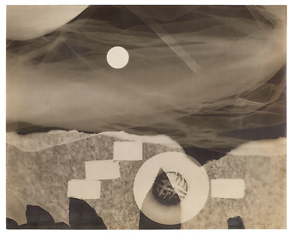 Sometime in late 1924 or early 1925, Man Ray embarked on a series of fantastical rayographs that mark a departure from his skewed views of familiar objects. Each image features a celestial body, but it shifts from sun to moon across various pictures of ethereal realms and appears as an eyelike, astral orb in an astonishing sequence of otherworldly vistas. Rather than invite curiosity through the transformation of everyday things, these rayographs (including this one) provoke instead a state of wonder through what poet Robert Desnos called a “great imaginary maelstrom . . . a bouquet of vertigo.”