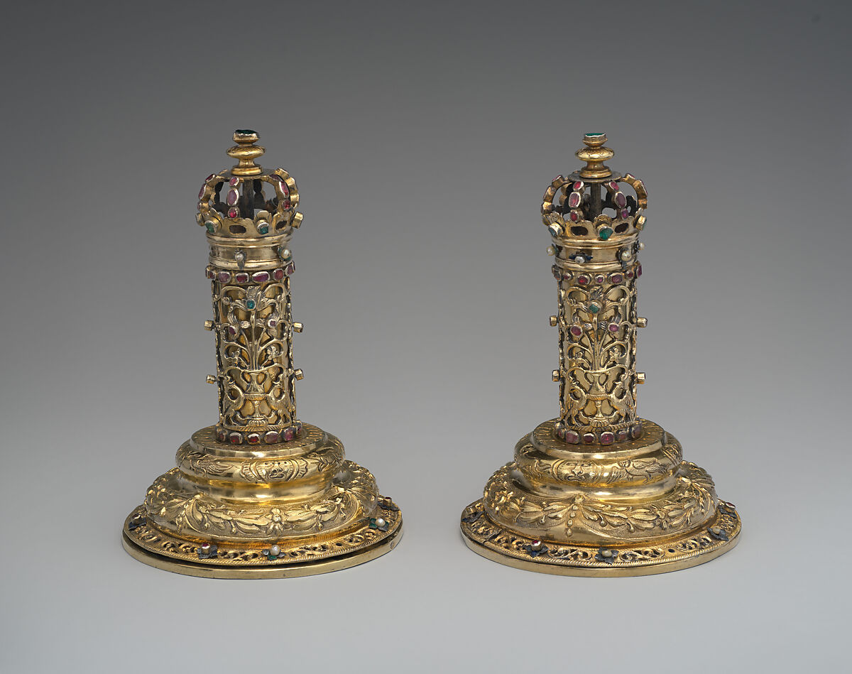 This pair of finials was used in the synagogue to adorn the top of the staves holding the Torah scroll, the first five books of the Hebrew Bible. The Torah is decorated and honored with a set of vestments and ornaments which included finials, possibly in combination with a crown, and shield. Torah finials are used in almost all Jewish communities, and their different designs are responsive to local traditions. The ornate decoration of this pair, further embellished with pearls and precious gems, are testament to the wealth and influential status in the Eastern European congregations of the Austrian Empire.