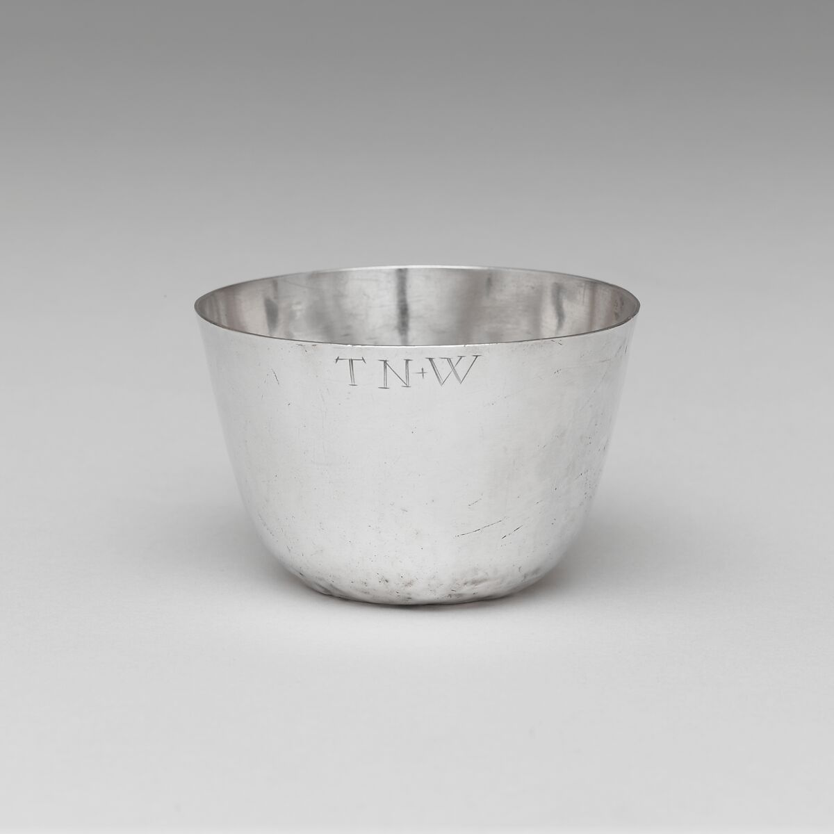 According to the donor, this tumbler originally belonged to Tryntje Nancy Whittaker, whose initials appear on its side. At the time of the Revolution it belonged to her granddaughter in Kingston. When the town was burned by British forces in 1777, the tumbler was thrown into a well on the premises in order to keep it out of enemy hands. After the rebuilding of the town, a slave of the family was sent down in the well to recover the lost silver. In digging, his shovel struck the tumbler, making a cut on its side. This break has been repaired.