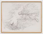Oldenburg and van Bruggen first represented the shuttlecock in the early 1990s, while developing a large-scale monument for the grounds of the Nelson-Atkins Museum of Art in Kansas City, Missouri. Preparatory drawings, sketches, and plans resulted in four massive hard sculptures of shuttlecocks that look as if they have just alighted on the lawn of the museum from a cosmic game of badminton. This drawing, produced more than a decade later, shows the fanciful potential of the object to disrupt any scene. Here, a depiction of a monument in autumn becomes a swirling fantasy through the chimeric representation of a Sphinx with a shuttlecock head.