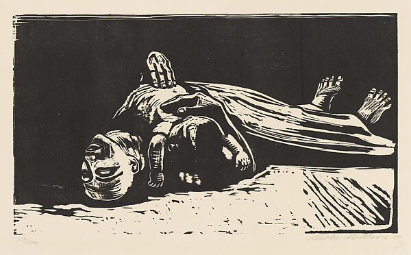 Kollwitz’s leftist politics and mission to make progressive art widely available had a great influence internationally and aligned with the goals of Taller de Gráfica Popular artists. In the portfolio War, Kollwitz created moving portrayals of suffering. These seven woodcuts, published in the wake of World War I, are powerful indictments of combat and have become universal symbols for grieving. In Widow II, a corpse-like woman lies on the ground, a limp baby slumped across her chest. The stiffness and skeletal quality of her body support associations with death, while the stark black reflects Kollwitz’s comment that "pain is totally dark." Kollwitz herself suffered great loss. At the beginning of the war, her younger son Peter volunteered for combat with her help and died shortly later while fighting in Belgium.