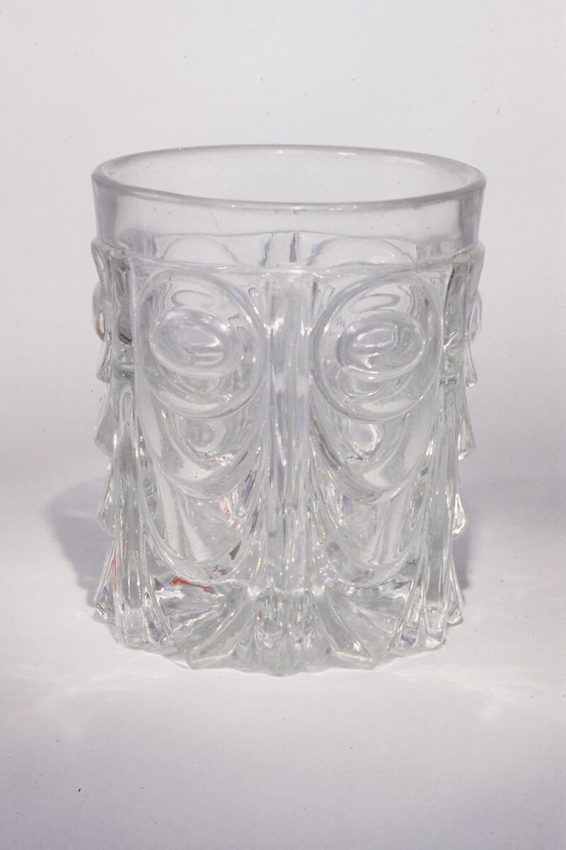 This tumbler closely resembles the first pressed glass tumbler made in America. Made by Deming Jarves of the Boston and Sandwich Glass Company in 1827, it is now known only through a period illustration. Like the tumbler Jarves designed, this one is decorated with "eye and scale" and "pillar flute" patterns on its body and a star pattern on its base. Although it has the appearance of pressed glass, the tumbler was evidently pressure-blown. The pattern on the exterior is very crisply defined, while inside there is a slight shadow of the design detectable by touch. These characteristics suggest a blown technique rather than a pressed one. Pressure-blown glass in this style was manufactured in France as early as 1834; the technique is not presently known to have been used by American glassmakers. Lacking a documented example of the tumbler Jarves made in 1827 to compare, the American attribution of this piece is questionable.