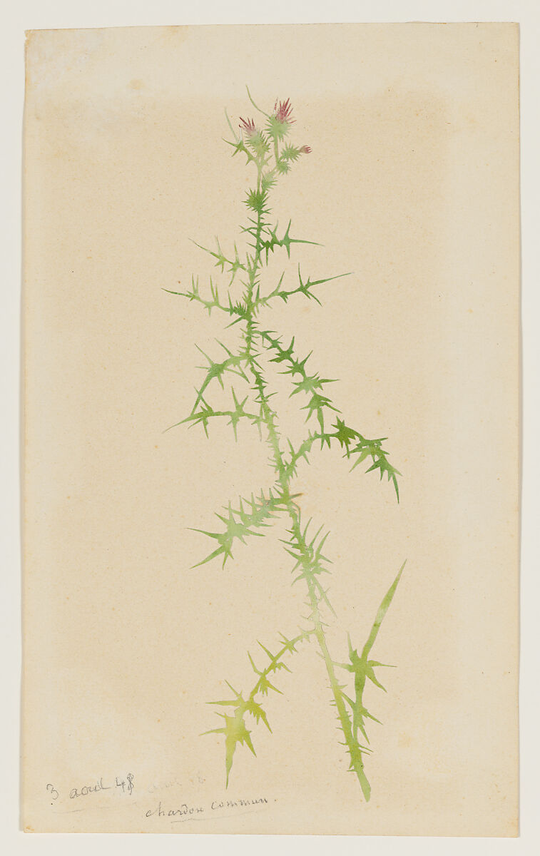 Although Sand’s work as an amateur watercolorist is increasingly appreciated, less is known about her practice of cutting paper to depict plant life. This example achieves a particularly naturalistic effect with the application of watercolor. Demonstrating extraordinary dexterity, Sand cut a sheet of paper painted with a subtle gradation of green into the delicate, spiky forms of a thistle crowned with small purple flowers.