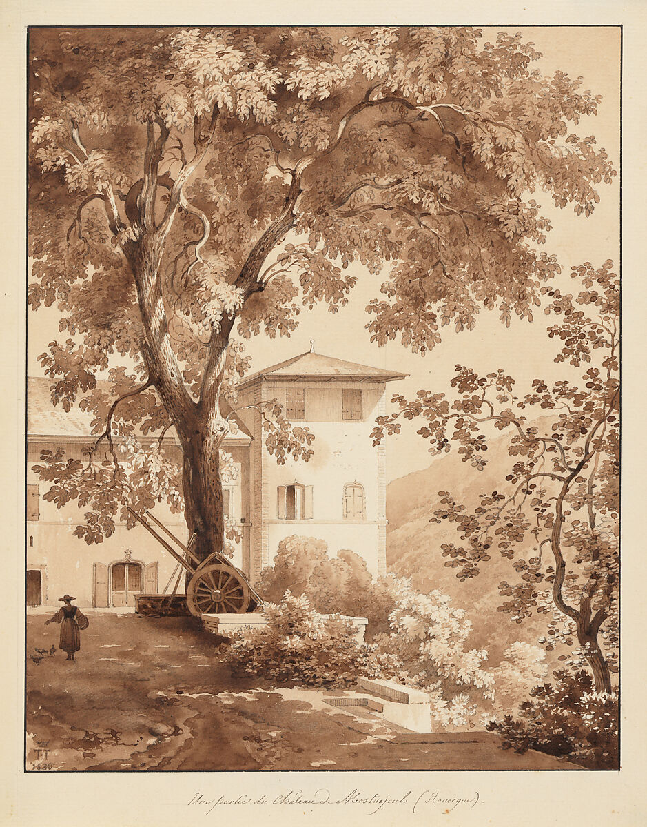 This detailed drawing shows a partial view of the Chateau de Mostuéjouls in the region of the Midi-Pyrénées in the south of France. The rendering of different qualities of light—the dappled shadows in the foreground and bright sun on the hillside and tower—suggest the influence in Romanticism on the artist who otherwise took a classical approach to his picturesque landscape compositions.1830, the year inscribed on this sheet, marked a return to painting for Turpin de Crissé following the July Revolution when he resigned from the administrative roles he had occupied during the Restoration.