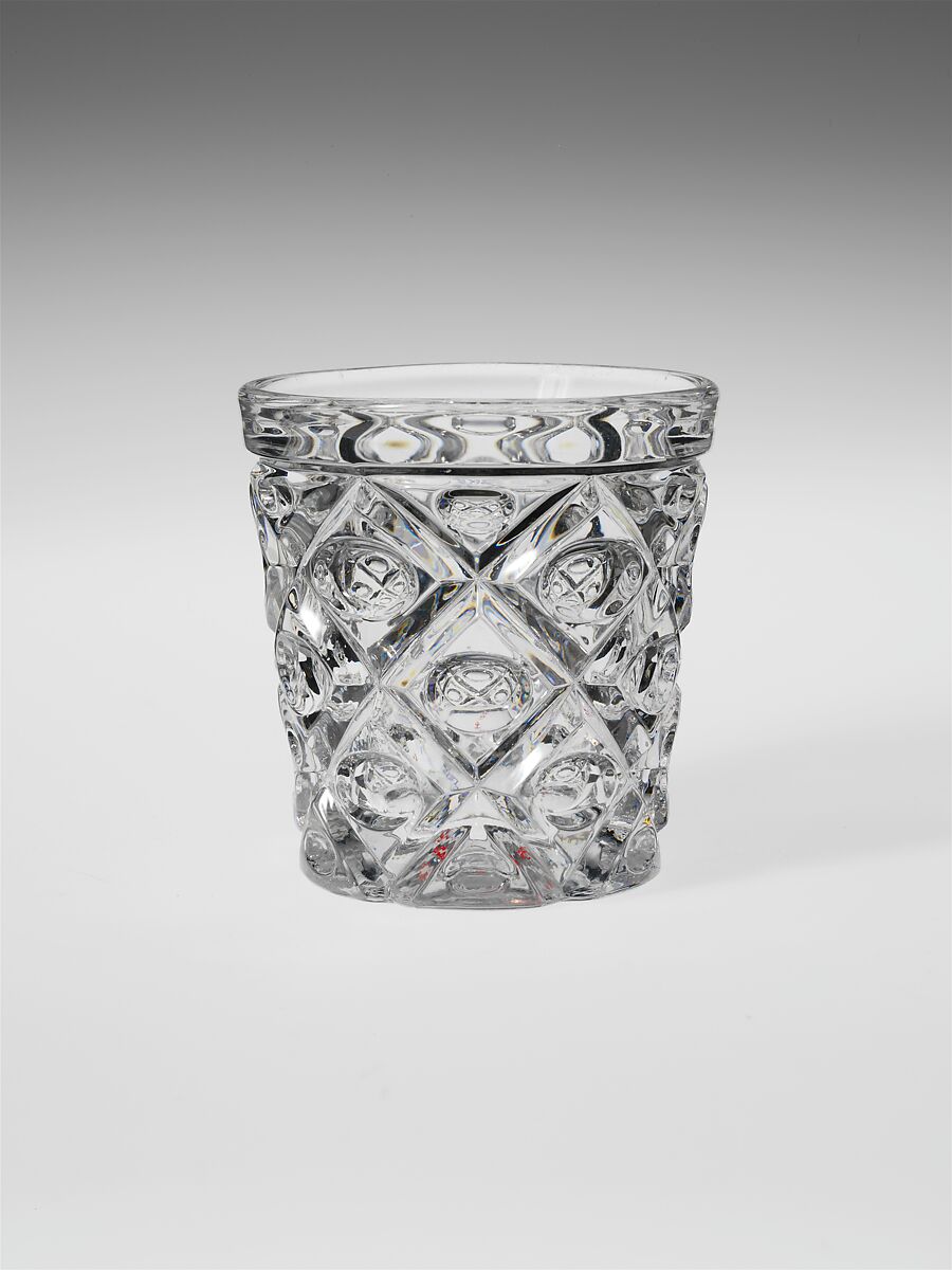 With the development of new formulas and techniques, glass-pressing technology had improved markedly by the late 1840s. By this time, pressed tablewares were being produced in large matching sets and innumerable forms. During the mid-1850s, colorless glass and simple geometric patterns dominated. Catering to the demand for moderately-priced dining wares, the glass industry in the United States expanded widely, and numerous factories supplied less expensive pressed glassware to the growing market. At the Exhibition of the Industry of All Nations at New York’s Crystal Palace in 1853, for example, the New England Glass Company exhibited 130 pieces of one design, "consisting of bowls, tumblers, champagnes, wines, and jelly glasses." This object belongs to one such service. Although the glass manufactory is not known, the glassware is very typical of the large services that were very popular with America’s middle class in the nineteenth century.