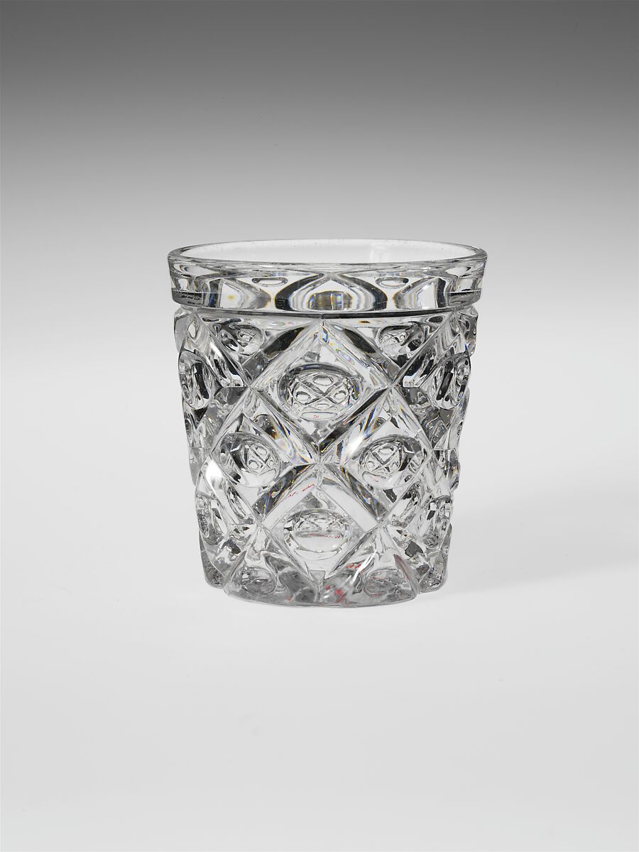 With the development of new formulas and techniques, glass-pressing technology had improved markedly by the late 1840s. By this time, pressed tablewares were being produced in large matching sets and innumerable forms. During the mid-1850s, colorless glass and simple geometric patterns dominated. Catering to the demand for moderately-priced dining wares, the glass industry in the United States expanded widely, and numerous factories supplied less expensive pressed glassware to the growing market. At the Exhibition of the Industry of All Nations at New York’s Crystal Palace in 1853, for example, the New England Glass Company exhibited 130 pieces of one design, "consisting of bowls, tumblers, champagnes, wines, and jelly glasses." This object belongs to one such service. Although the glass manufactory is not known, the glassware is very typical of the large services that were very popular with America’s middle class in the nineteenth century.